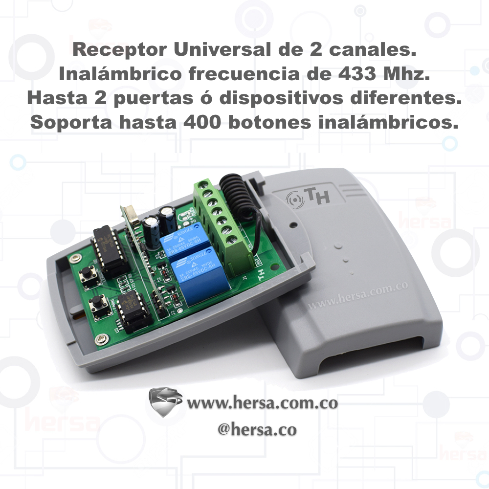 El receptor inalámbrico de 2 canales TH, es un accesorio además de óptimo, práctico tanto en su instalación como en su configuración, es un dispositivo que permite la apertura de dos electroimanes, cerraduras eléctricas, cantoneras o prácticamente cualquier dispositivo de apertura a una distancia de 50 metros y de manera independiente, con una capacidad de enrolamiento para 400 controles remotos (no incluidos).